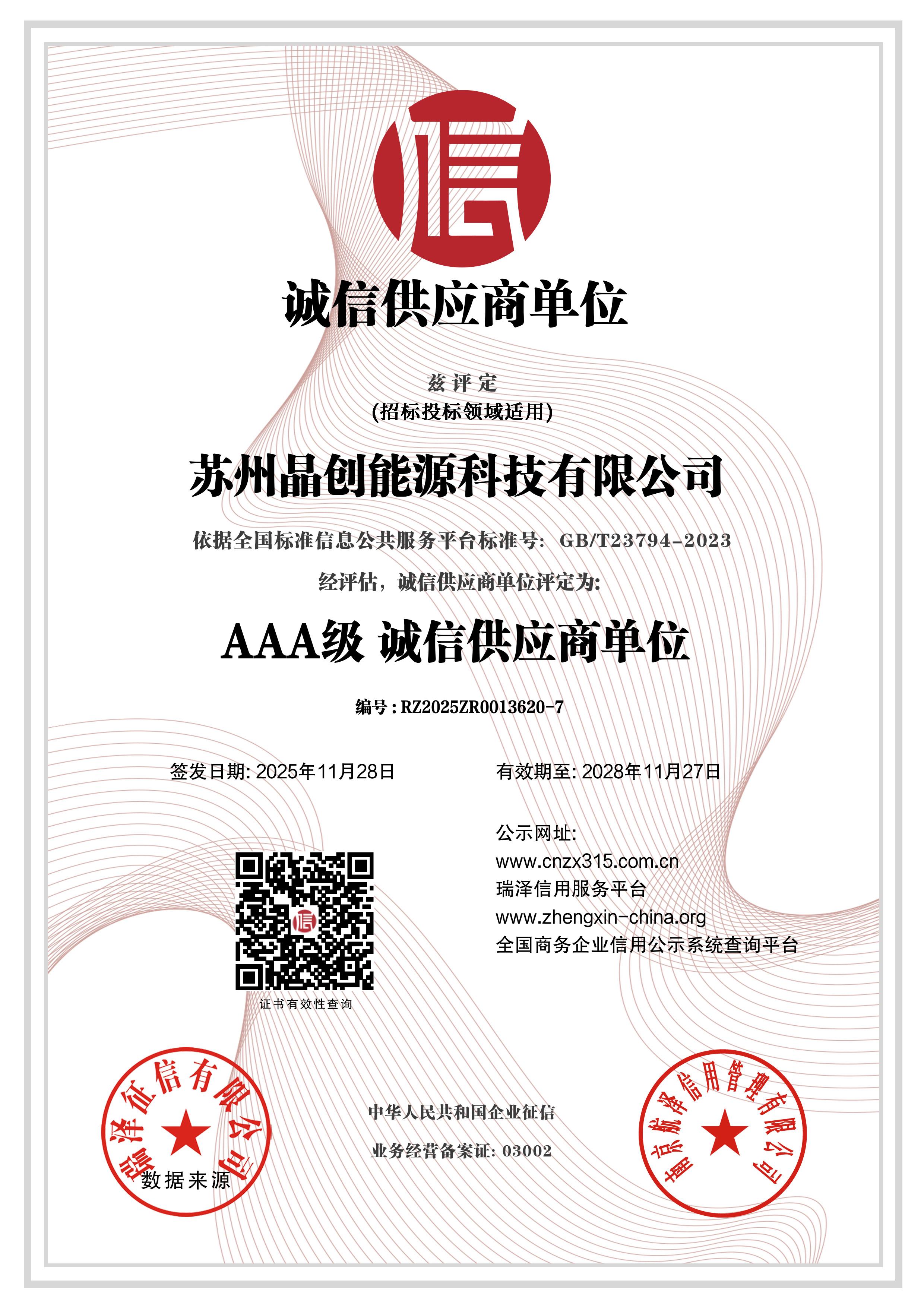 AAA级诚信供应商单位