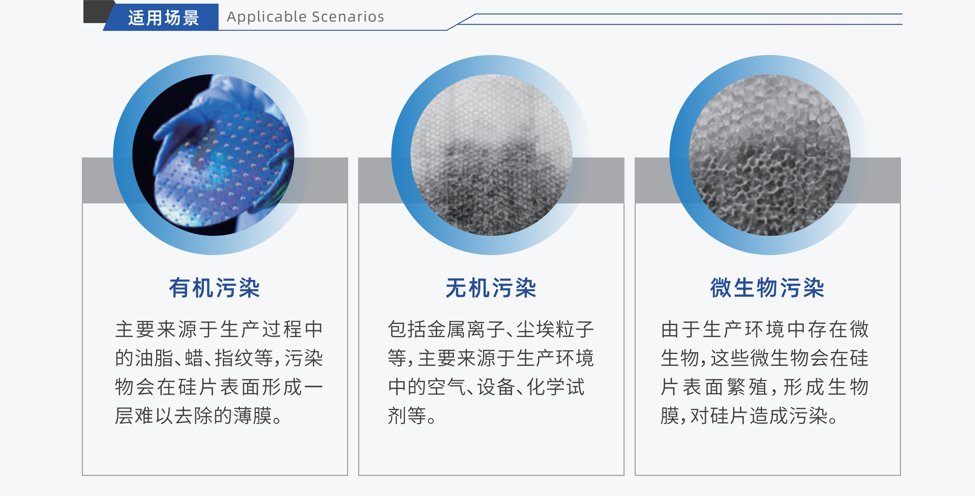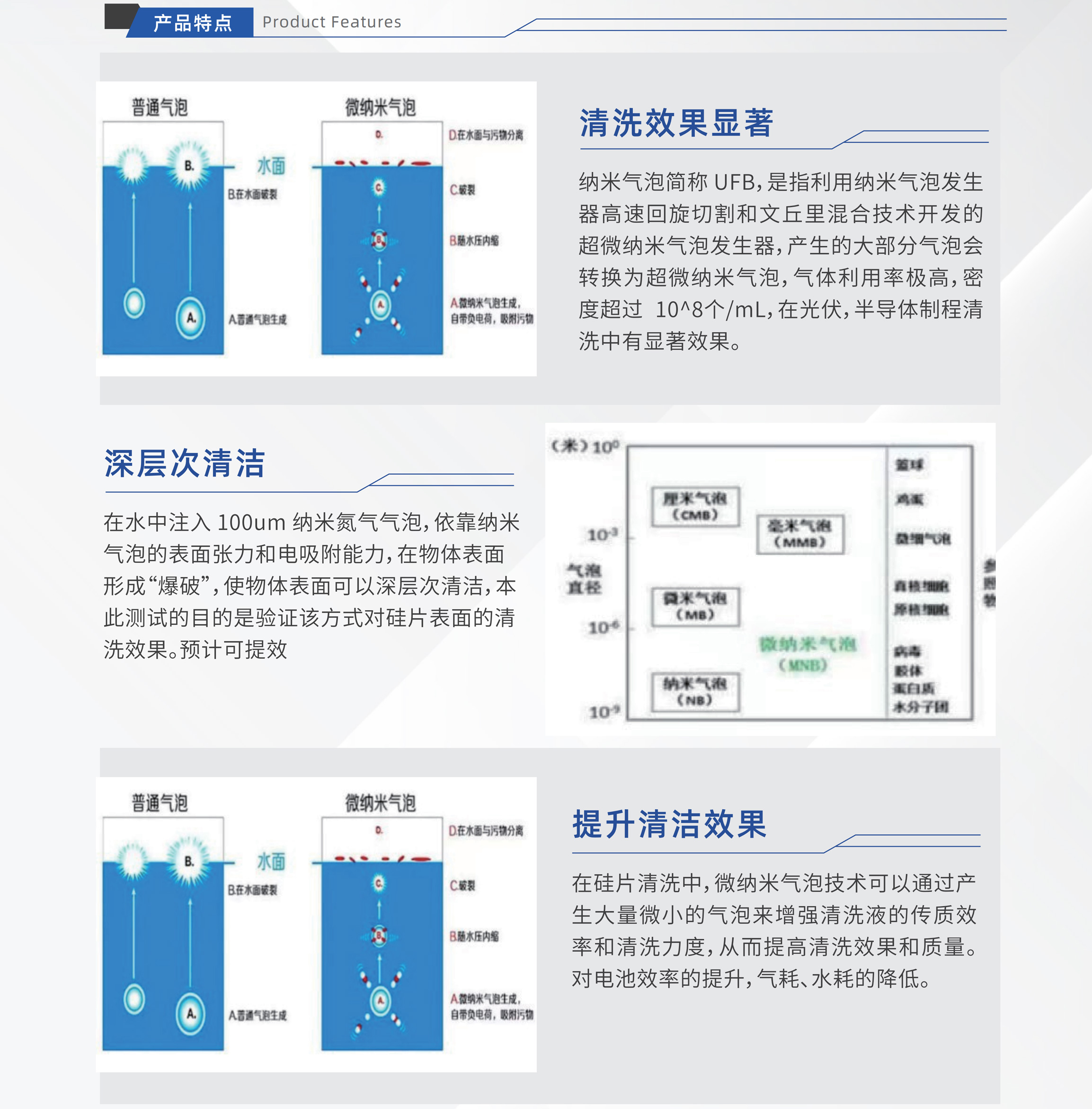 传统清洗方法:包括湿式化学清洗、超声波清洗等,这些方法在去除硅片表面行染物方面具有一定效果,但存在清洗不均匀、易产生二次污染等问题。 利用微纳米气泡的独特性质,如高传质效率、强氧化性等,对硅片进行高效、环保的清洗。与传统清洗方法相比,微纳米气泡清洗具有更好的清洗效果和环保性。